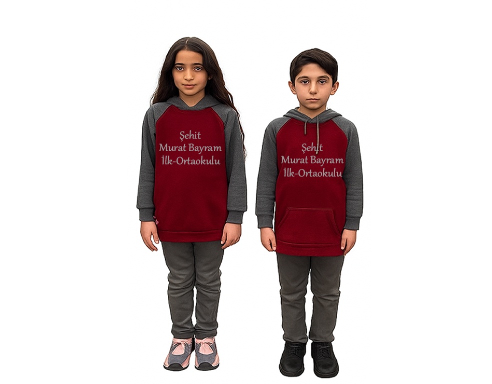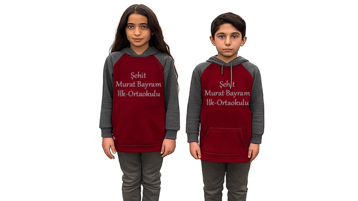 Yaz Dönemi için pamuklu, kısa kollu polo yaka gri renkli ve okul ismi yazılı bordo tişört. Kış Dönemi için pamuklu kapüşonlu okul ismi yazılı uzun kollu tişört.