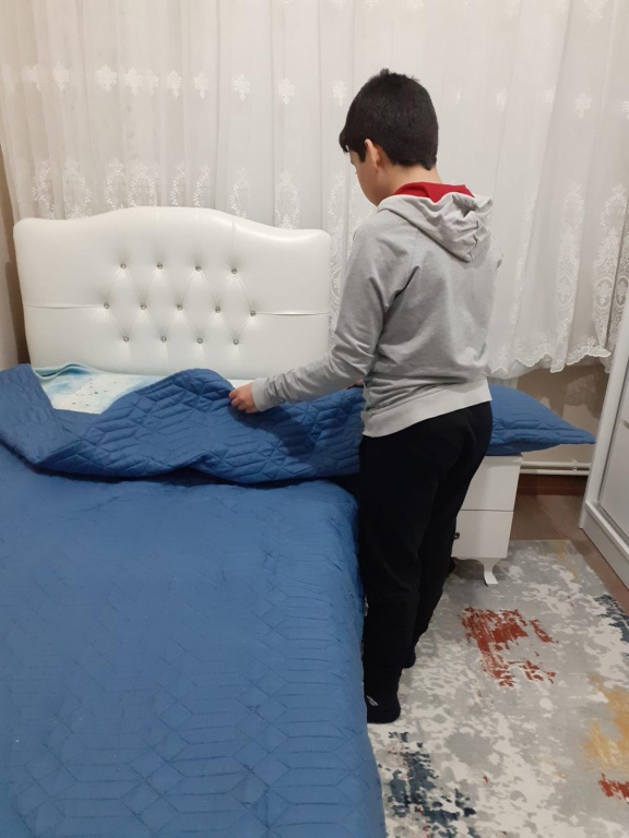 Sağlıklı Uyku Düzeni ve Yatak Hijyenini Koruma kazanımı becerisiyle öğrenciler düzenli uyku saatlerine uydular ve haftalık nevresim çarşaf değiştirme becerilerini edindiler.